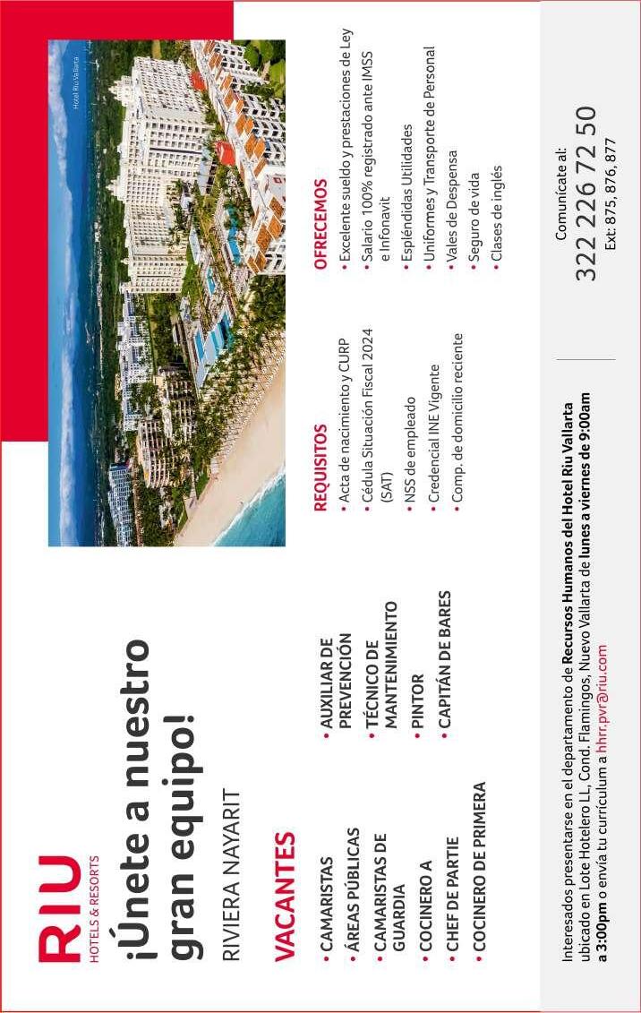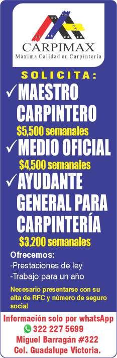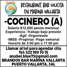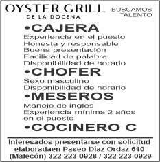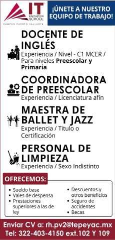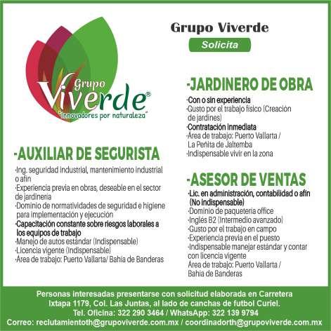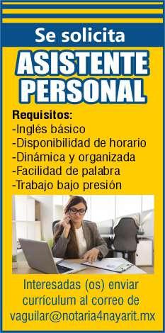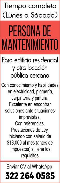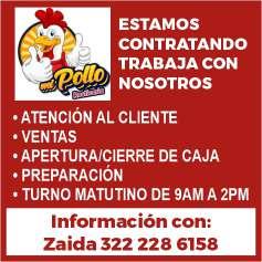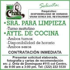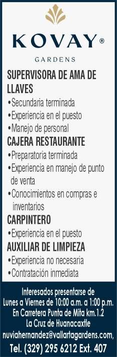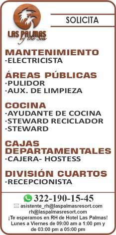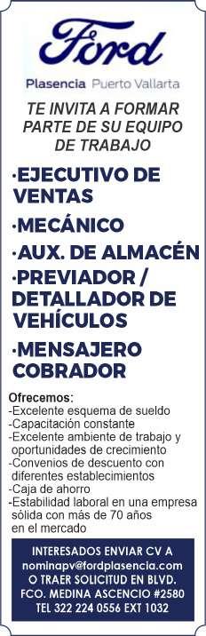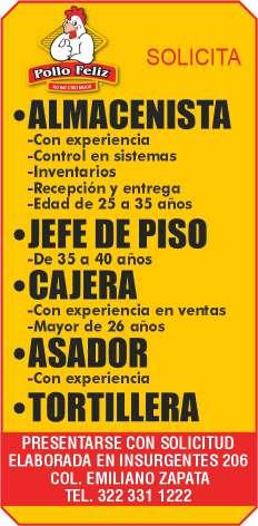 ble. Ofrecemos excelente sueldo, prestaciones de ley. Inf. 322 35 651-14.+
