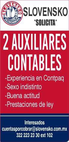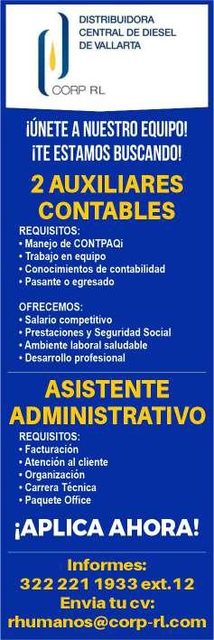 Estamos contratando 2 auxiliares contables, asistente administrativo. Inf. 322 22 119-93, ext. 12.+