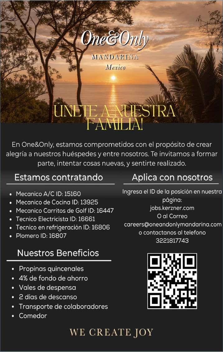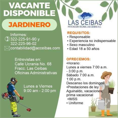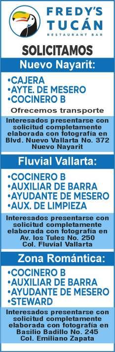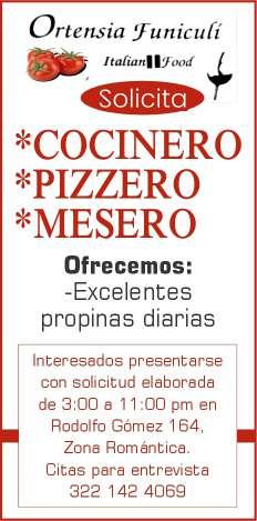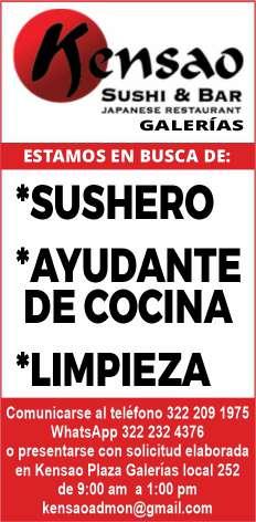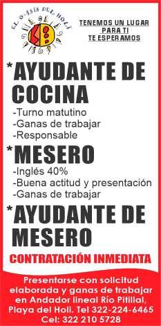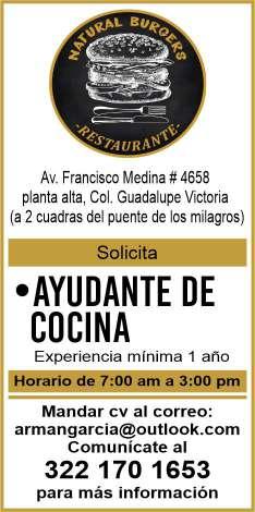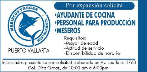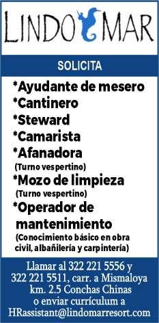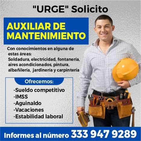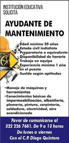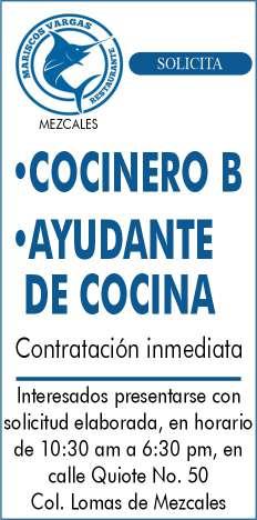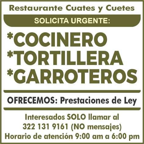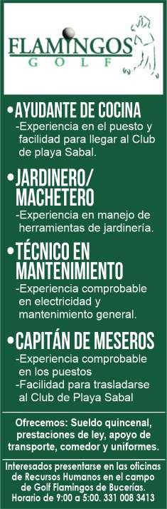 Solicitamos ayudante de cocina, jardinero/machetero, técnico en mantenimiento. Ofrecemos apoyo de transporte, salario quincenal, alimentos, uniformes. Inf. 331 00 834-13.+