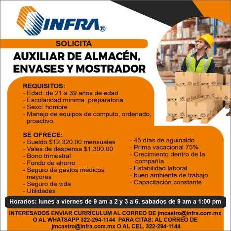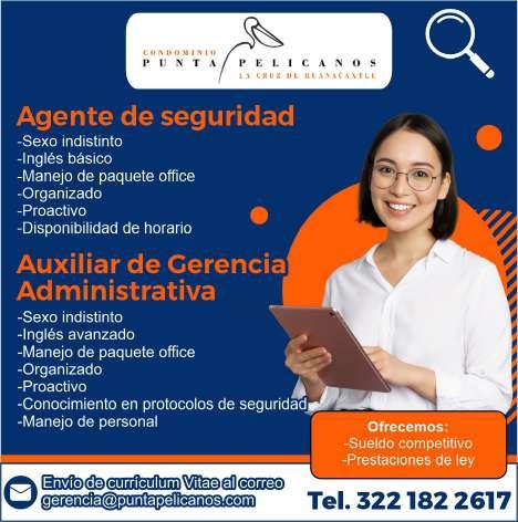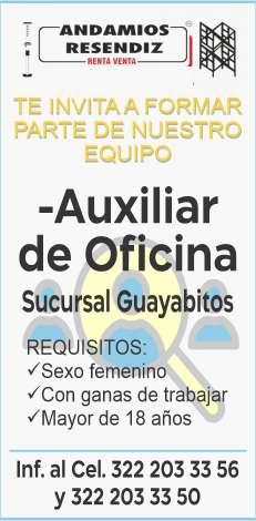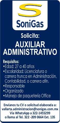 Estamos contratando auxiliar administrativo, de 25 a 35 años, sexo femenino, escolaridad preferente administración, experiencia atención al cliente, disponibilidad de horario. Inf. 322 22 481-41.+