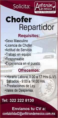 Solicitamos chofer repartidor, sexo masculino, experiencia el puesto, trabajo en equipo, ofrecemos prestaciones de ley. Enviar CV al correo: contabilidad2@anfitriondemexico.com. mx Tel. 322 22 281-30.+
