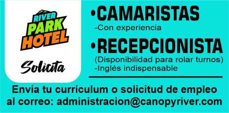 ¿Quieres formar parte de nuestro equipo? Camaristas con experiencia, recepcionista inglés indispensable. Enviar cv a: administracion@canopyriver.com Chofer particular, con licencia,