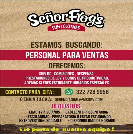 Estamos buscando personal para ventas de 17 a 30 años, escolaridad preparatoria o estudiando, sociable. Ofrecemos sueldo, comisiones, despensa, prestaciones de ley. Contacto para cita. 322 72 899-58.+