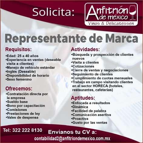 Solicitamos representante de ventas, sexo femenino, de 25 a 40 años, experiencia en ventas, inglés, trabajo en campo, ofrecemos prestaciones de ley. Enviar CV al correo: contabilidad2@anfitriondemexico.com. mx Tel. 322 22 281-30.+