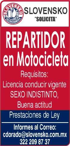 cir vehículo y contar con licencia vigente, experiencia 2 años mínimo en ventas y atención al cliente, preparatoria terminada. Inf. 329 29 654-88.+
