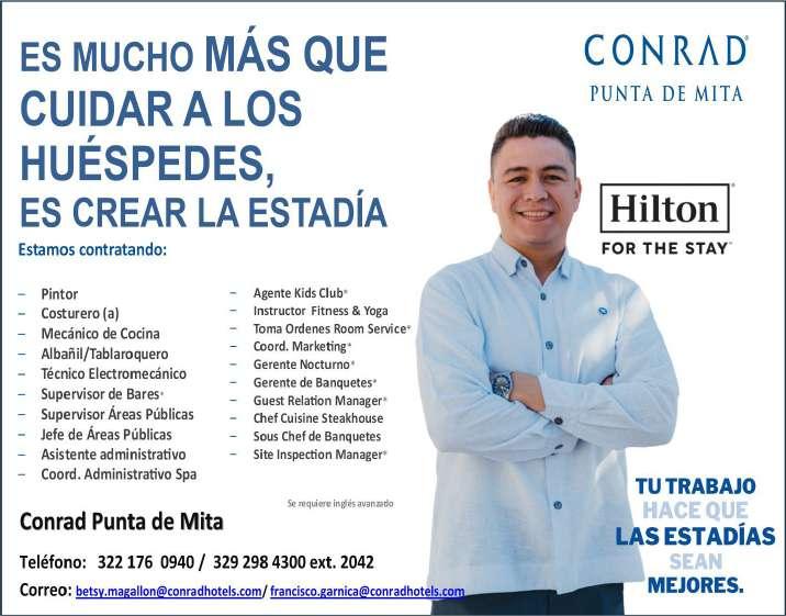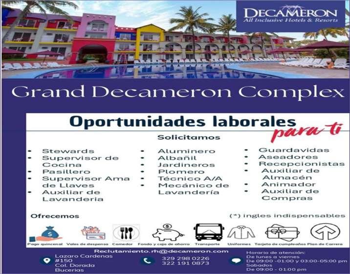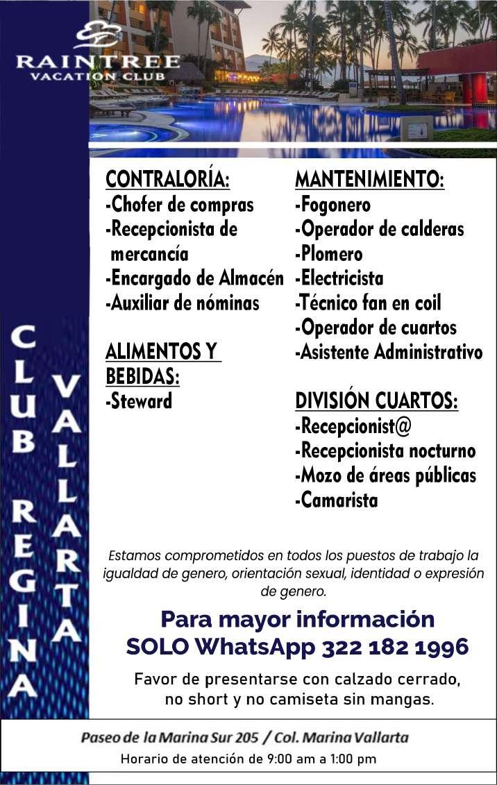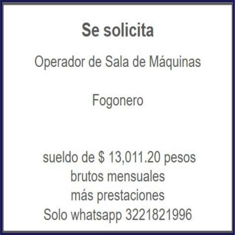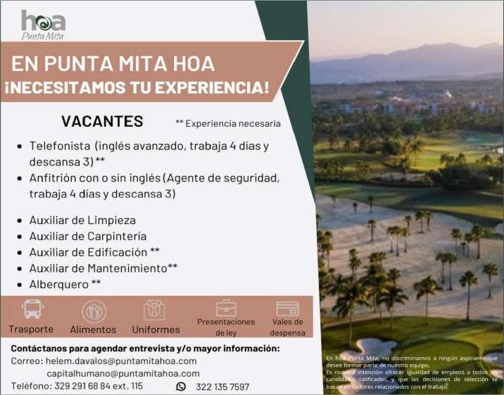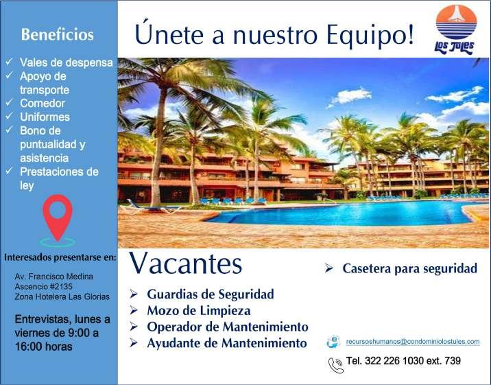 Solicitamos ayudante de cocina, jardinero/machetero, técnico en mantenimiento, supervisor de mantenimiento. Ofrecemos apoyo de transporte, salario quincenal, alimentos, uniformes. Inf. 331 00 834-13.+