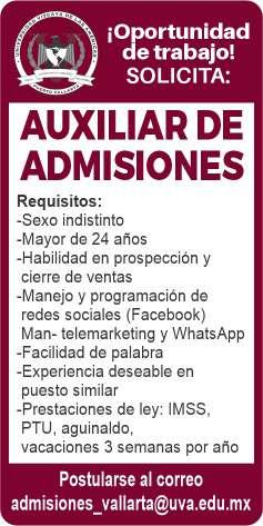 Auxiliar para control administrativo, sexo femenino, de 25 a 40 años. Ofrecemos sueldo base y todas las prestaciones de ley. Inf. 322 20 915-99, 322