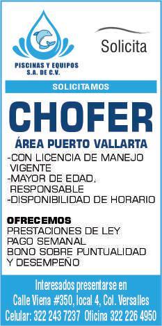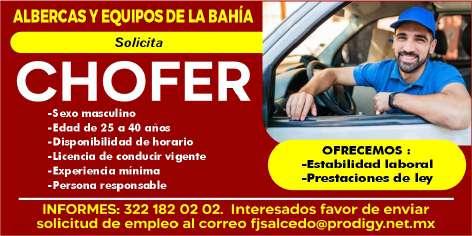 Se solicita chofer, licencia vigente, mayor de edad, acostumbrado a trabajar bajo presión, pueda cargar pesado, área Puerto Vallarta. Ofrecemos prestaciones de ley. Inf. 322 24 372-37, 322 22 649-50.+
