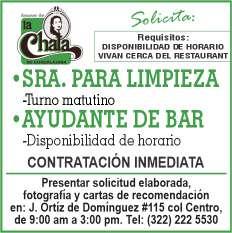 dores, secundaria terminada, disponibilidad de horario. Personal de limpieza. Ofrecemos prestaciones de ley. Citas. 322
