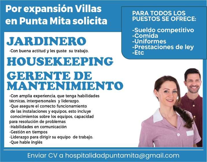 Solicitamos ayudante de cocina, jardinero/machetero, técnico en mantenimiento,