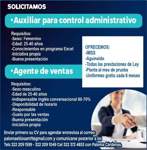 Auxiliar para control administrativo, sexo femenino, de 25 a 40 años. Ofrecemos sueldo base y todas las prestaciones de ley. Inf. 322 20 915-99, 322 20 910-49.+