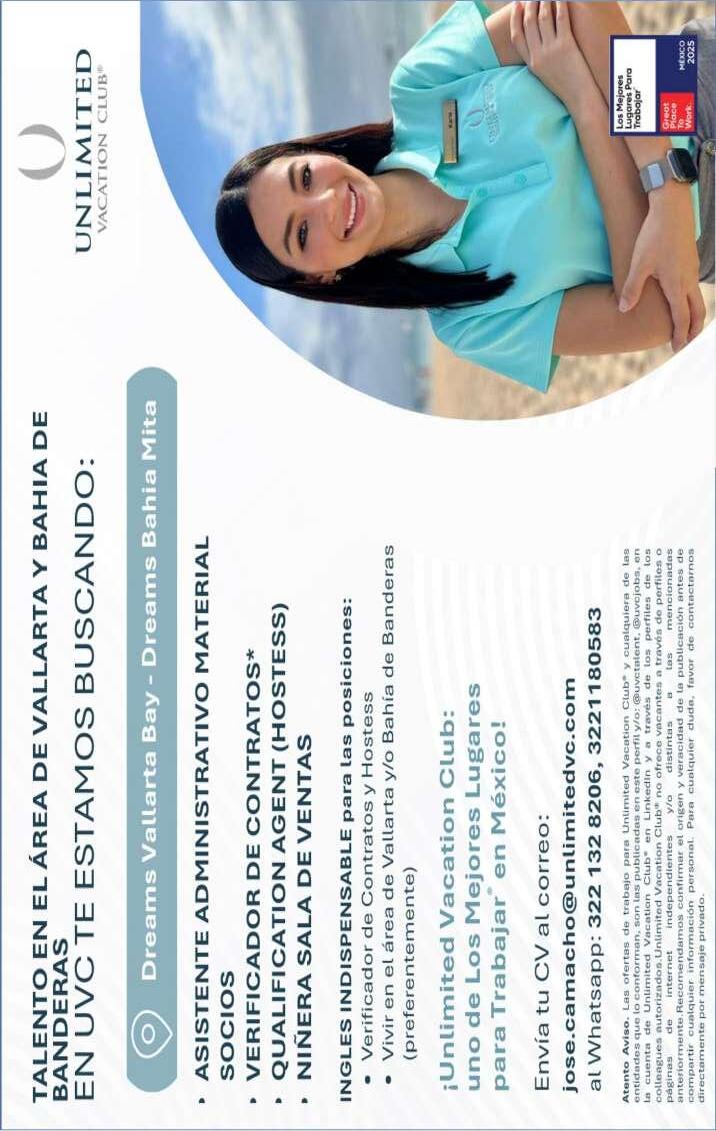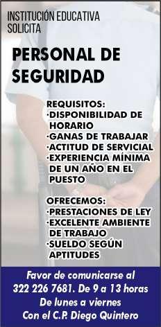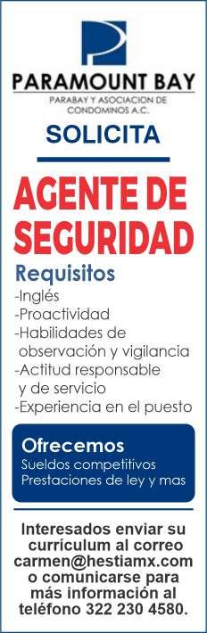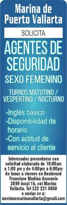 Únete a nuestro equipo de trabajo, solicitamos agentes de seguridad para muelles de la marina, sexo femenino, ingles básico, experiencia en el puesto, disponibilidad de horario. Inf. 322 22 103-95.+
