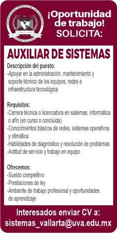 Estamos contratando auxiliar administrativo, de 25 a 35 años, sexo femenino, escolaridad preferente administración, experiencia atención al cliente, disponibilidad de horario. Inf. 322 22 481-41.+