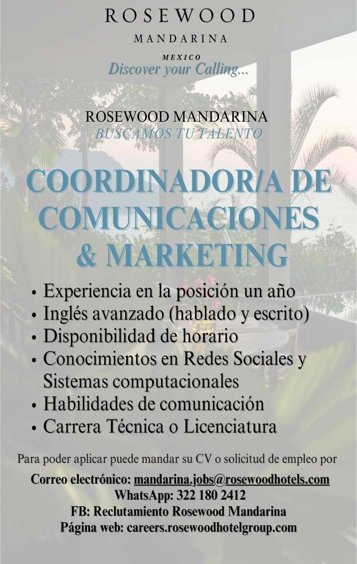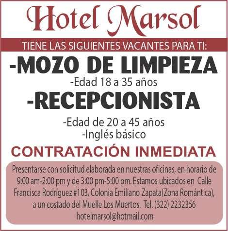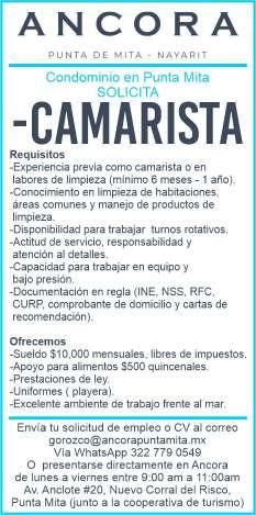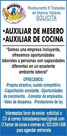 marina, sexo femenino, ingles básico, experiencia en el puesto, disponibilidad de horario. Inf. 322 22 103-95.+