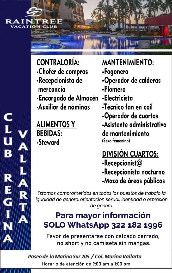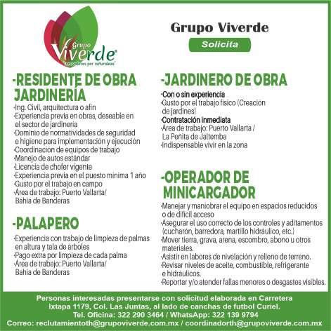 cina, jardinero/machetero, supervisor de mantenimiento. Ofrecemos apoyo de transporte, salario quincenal, alimentos, uniformes. Inf. 331 00 834-13.+