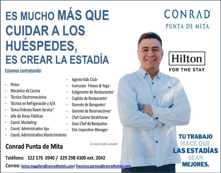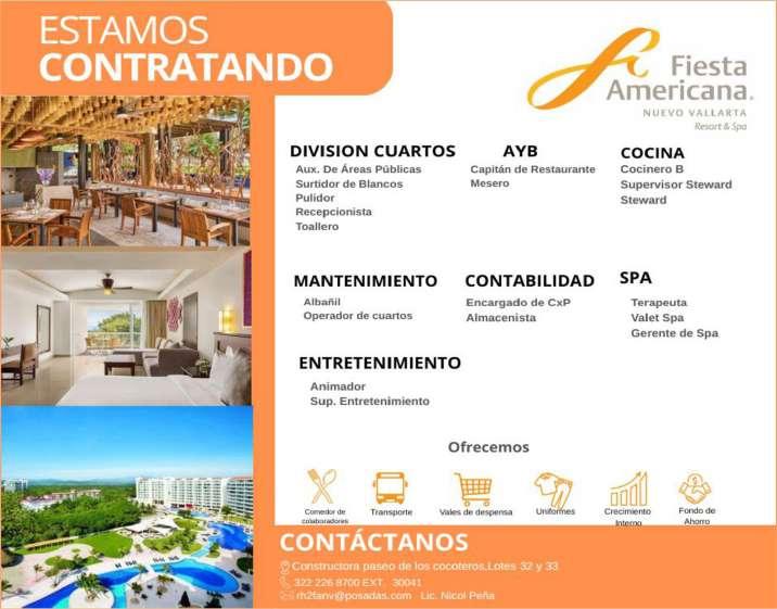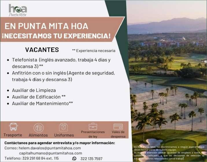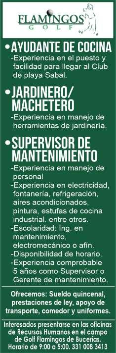 Solicitamos ayudante de cocina, jardinero/machetero, supervisor de mantenimiento. Ofrecemos apoyo de transporte, salario quincenal, alimentos, uniformes. Inf. 331 00 834-13.+