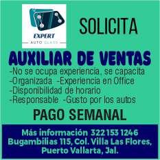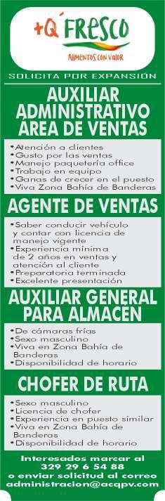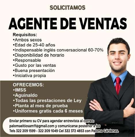 Se parte de nuestro equipo Agente de ventas, ambos sexos, de 25 a 40 años, inglés conversacional 60 a 70%. Auxiliar para control administrativo, sexo femenino, de 25 a 40 años. Ofrecemos sueldo base y todas las prestaciones de ley. Inf. 322 20 915-99, 322 20 91049.+
