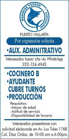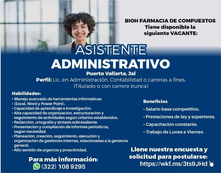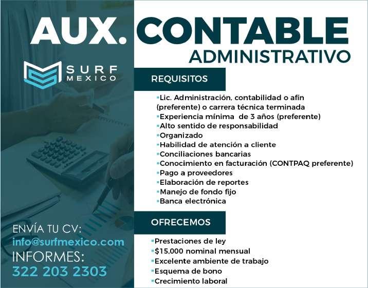 Estamos contratando auxiliar administrativo, de 25 a 35 años, sexo femenino, escolaridad preferente administración, experiencia atención al cliente, disponibilidad de horario. Inf. 322 22 481-41.+