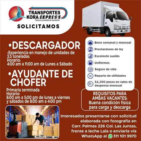 Forma parte de nuestro quipo como chofer de ruta, sexo masculino, licencia de conducir, experiencia en puesto similar, viva en zona Bahía de Banderas. Inf. 329 29 654-88.+