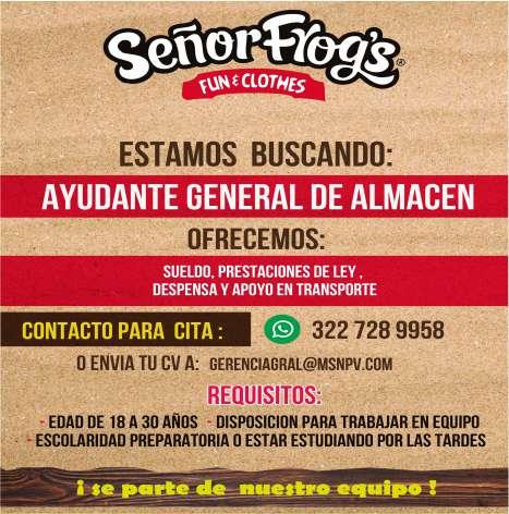 Estamos buscando ayudante general de almacén, de 18 a 30 años, escolaridad preparatoria o estudiando por las tardes. Ofrecemos sueldo, comisiones, despensa, prestaciones de ley. Contacto para cita. 322 72 899-58.+