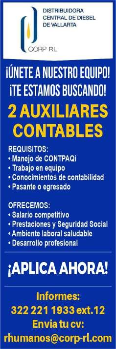 Estamos contratando 2 auxiliares contables, manejo de contpaqi, pasante o egresado. Inf. 322 22 119-93, ext. 12.+