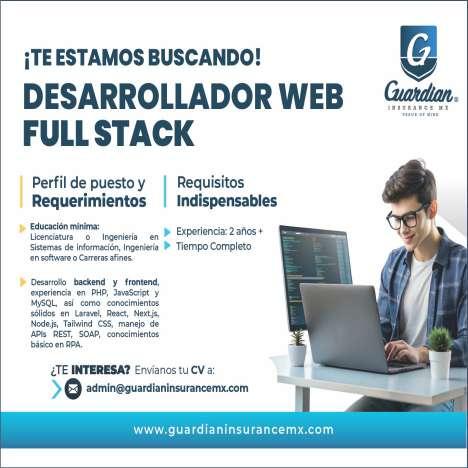 Se solicita desarrollador web full stack, licenciatura o ingeniería en sistemas. Informes admin@guardianinsurancemx. com