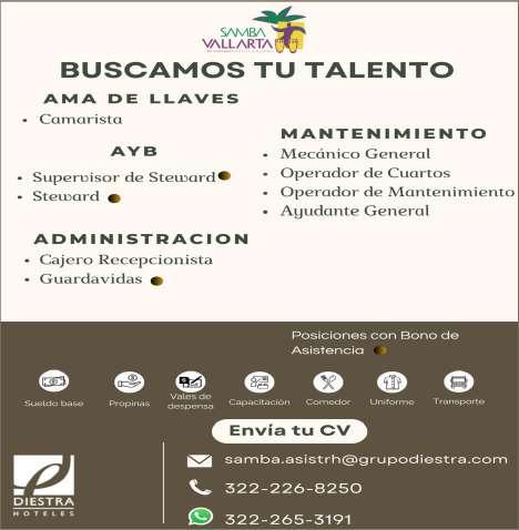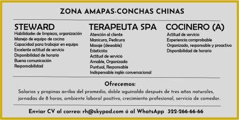 Solicitamos Steward y Cocina para zona Romántica. Envía tu CV o solicitud al. 322 15 62734.+