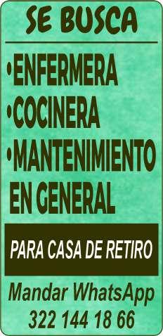 Se busca: Enfermera, cocinera y mantenimiento en general para casa de retiro. Mandar WhatsApp al. 322 14 418-66.+