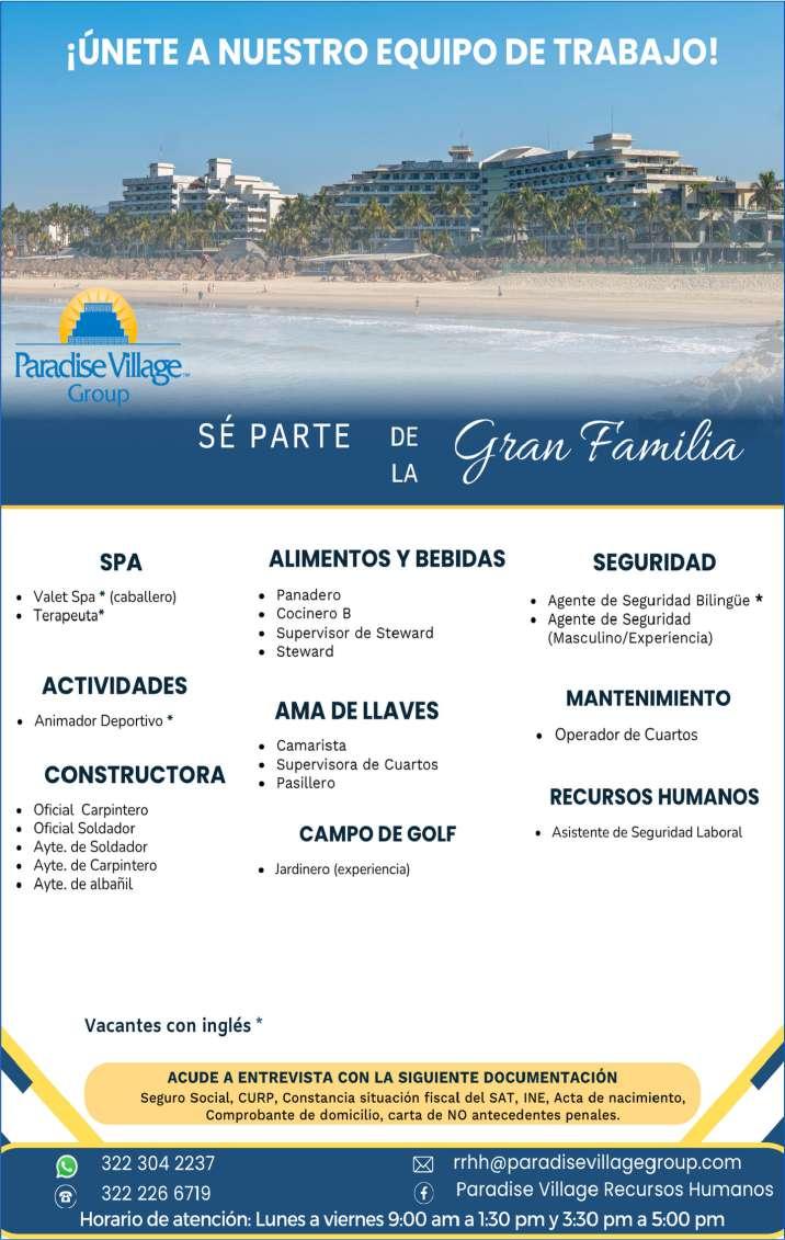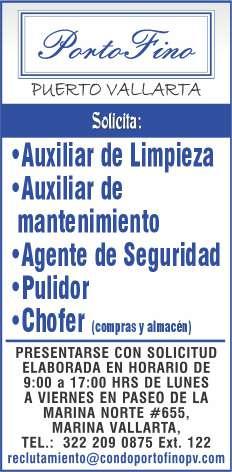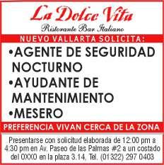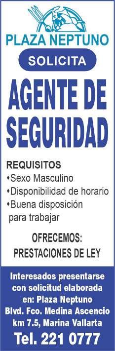 Solicitamos para área de Nuevo Vallarta: Agente de seguridad nocturno, ayudante de mantenimiento y mesero, de preferencia vivan cerca de la zona. Presentarse con solicitud elaborada de 12:00 pm a 4:30 pm en Av. Paseo de las Palmas #2 a un costado del. 322 29 70403.+