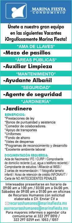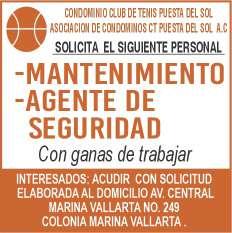 Solicitamos para área de Nuevo Vallarta: Agente de seguridad nocturno, ayudante de mantenimiento y mesero, de preferencia vivan cerca de la zona. Presentarse con solicitud