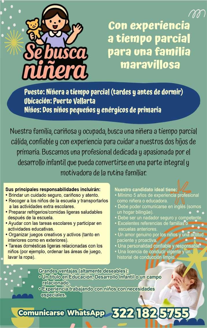 Se busca niñera con experiencia a tiempo parcial (tardes y antes de dormir) para una fa-