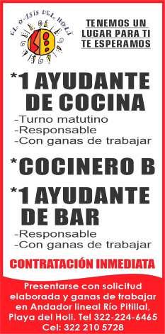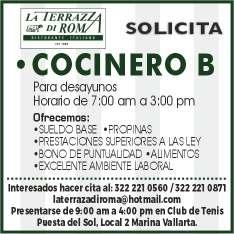 Se solicita cocinero B para desayunos, de 7 am a 3 pm. Citas al. 322 22 105-60, 322 22 108-