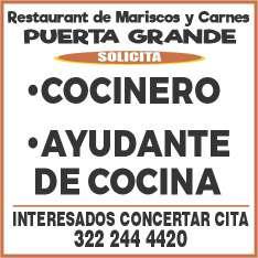 Buscamos cocinero, hostess, con buena presentación y disponibilidad de horario. Inf. 322 22 309-28, 322 22 309-29.+