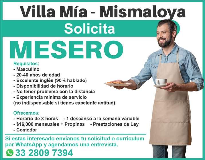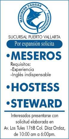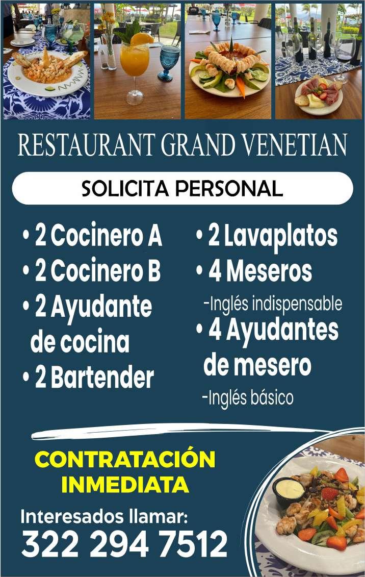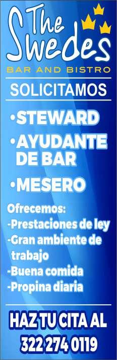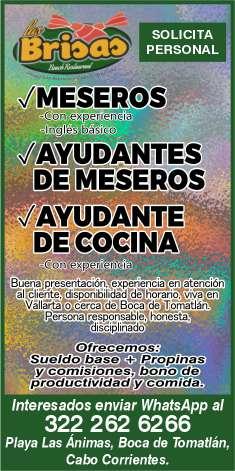 Se solicita urgentes meseros, ayudantes de meseros, solo llamadas de 9:00 am a 6:00 pm, no mensajes al. 322 13 19161.+