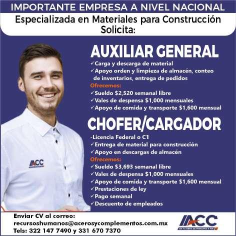 Chofer cargador. Licencia federal o C1, entrega de material de construcción, sueldo $3,693, $1,000 vales de despensa. Enviar tu CV recursoshumanos@acerosycomplementos.com.mx tel. 322 14 774-90.+