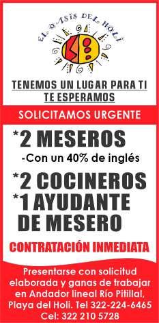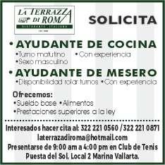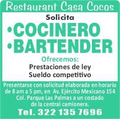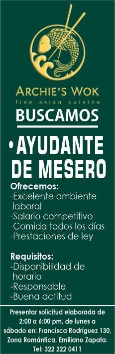 Se solicita ayudante de mesero y ayudante de cocina. Citas al. 322 22 105-60, 322 22 10871.+