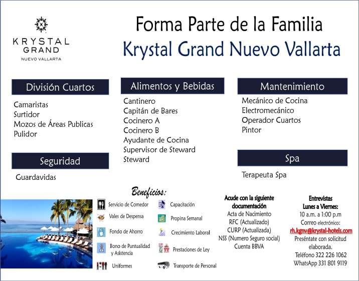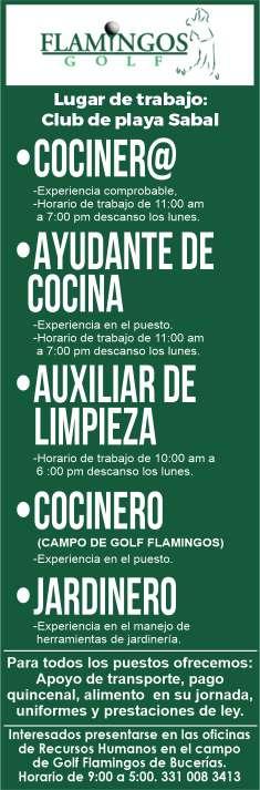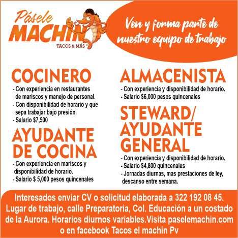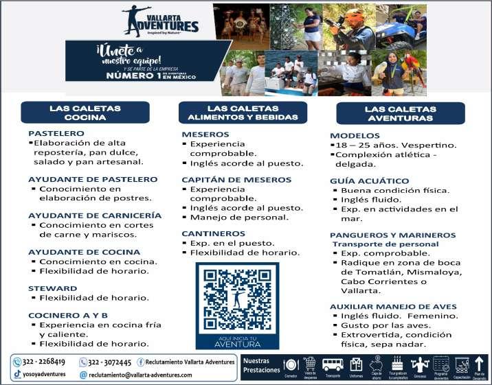 Únete a nuestro equipo como Cocinero, Ayudante de cocina, Auxiliar de limpieza informes experiencia, licencia de chofer vigente. Inf. 322 28 126-05.+