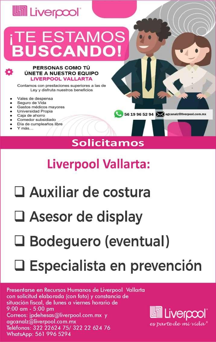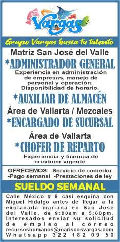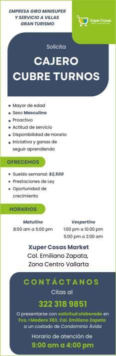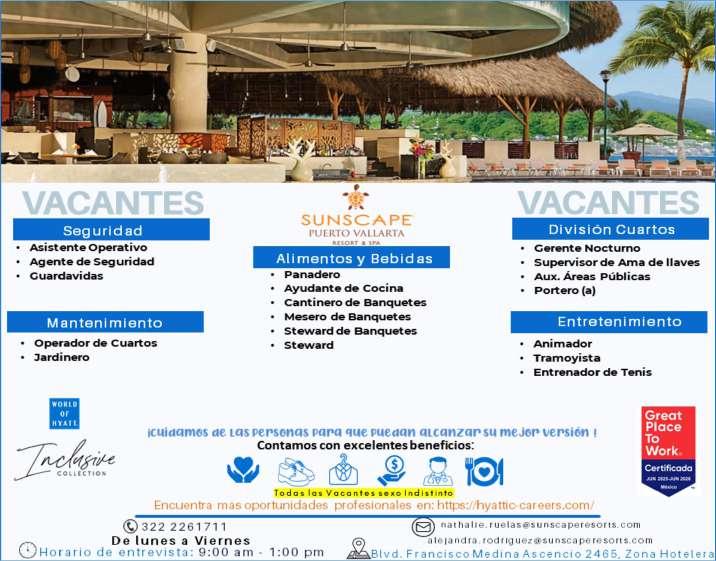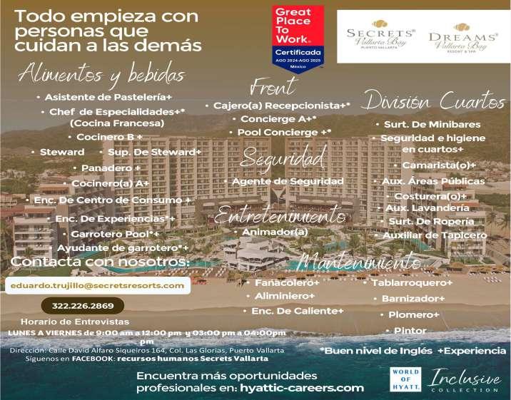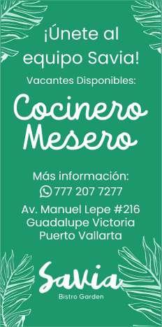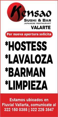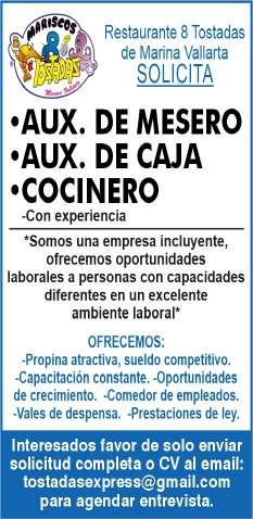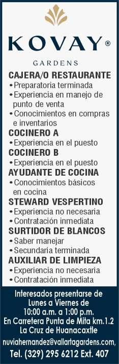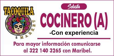 Buscamos cocineros con experiencia, hostess con buena presentación, mesero con disponibilidad de horario. Inf. 322 22 309-28, 322 22 309-29.+