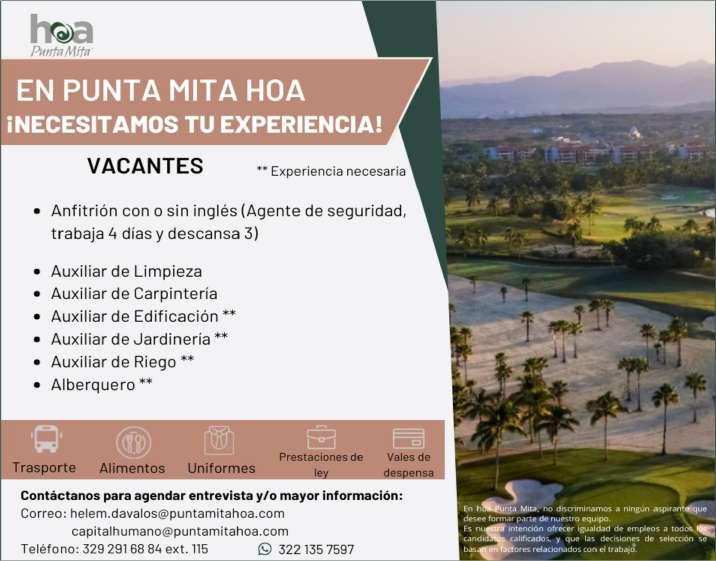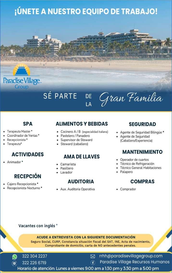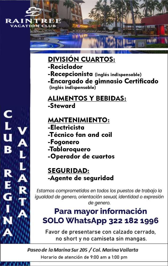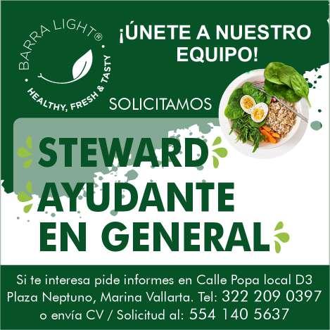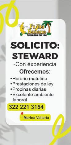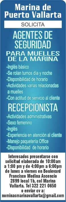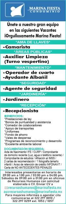 Área de Nuevo Vallarta, solicitamos agente de seguridad nocturno, ayudante de mantenimiento, pizzero, steward, mesero. Presentar solicitud elaborada. Inf. 322 29 704-03.+