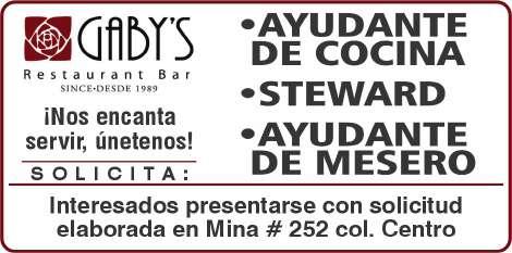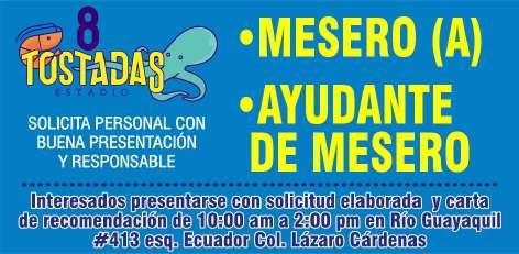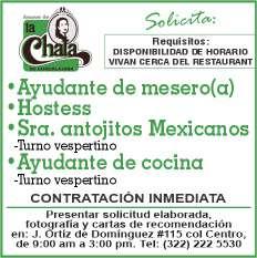 mos ayudante de mesera, sexo femenino, edad 18 a 25 años, excelente presentación, cocinera de 25 a 40 años, experiencia. Inf. 322 29 404-17.+