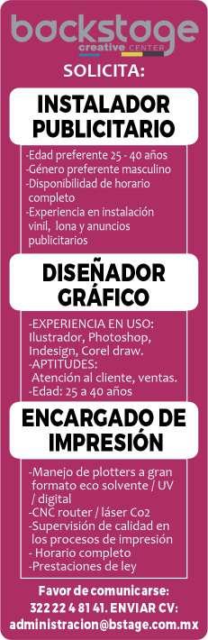 Solicitamos Diseñador Gráfico e Instalador publicitario. Inf. 322 22 481-41.+