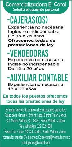 Área zona romántica solicitamos ayudante de mesera, sexo femenino, edad 18 a 25 años, excelente presentación, cocinera de 25 a 40 años, experiencia. Inf. 322 29 404-17.+