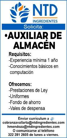 Solicitamos: Auxiliar de almacén, experiencia mínima 1 año, conocimientos básicos en computación, Enviar currículum a cobranzavallarta@ntdingredientes.com / hmendoza@ntd-