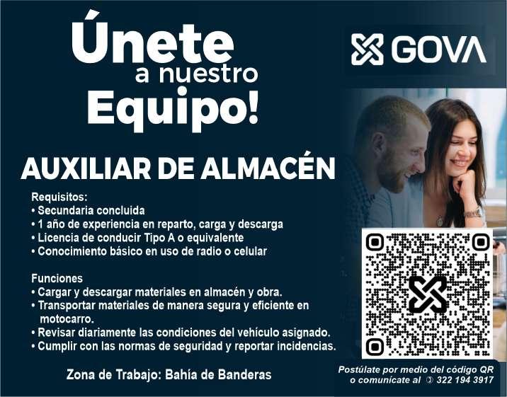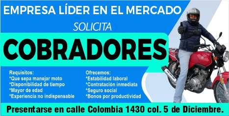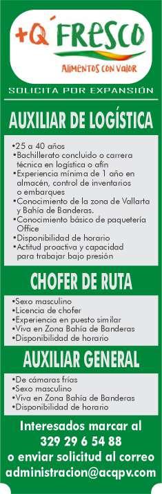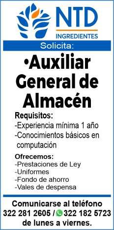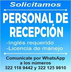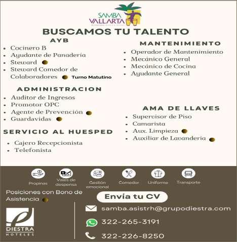 de manejo y motociclista, auxiliar de lavandería y limpieza. Envía solicitud por WhatsApp tel. 322 21 677-22.+