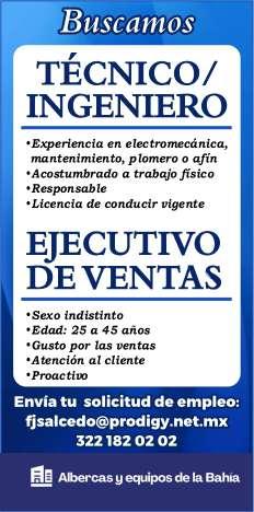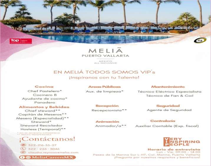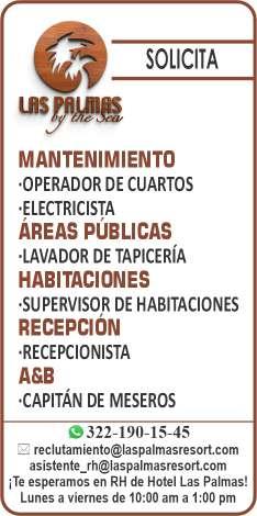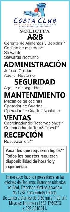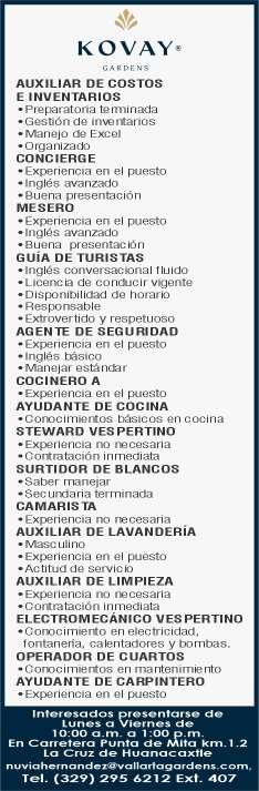 Estamos en busca del siguiente personal: Auxiliar de Costos e Inventarios, Mesero, Guía de Turistas, Camarista, Electromecánico Vespertino, Ayudante de Cocina. Informes al. 329 29 562-12, Ext. 407.+