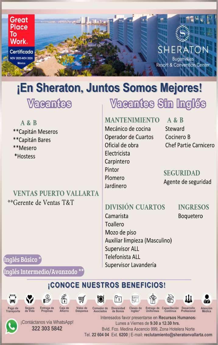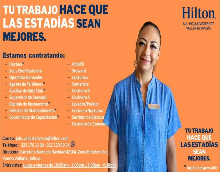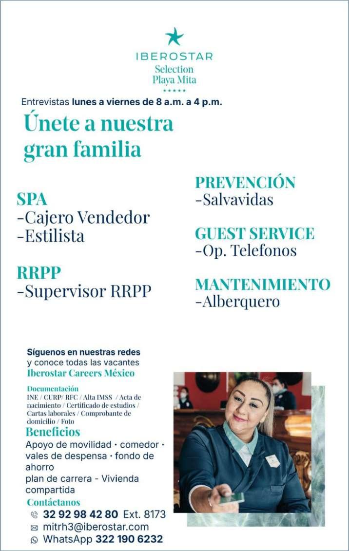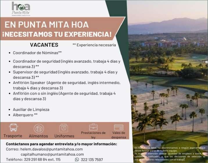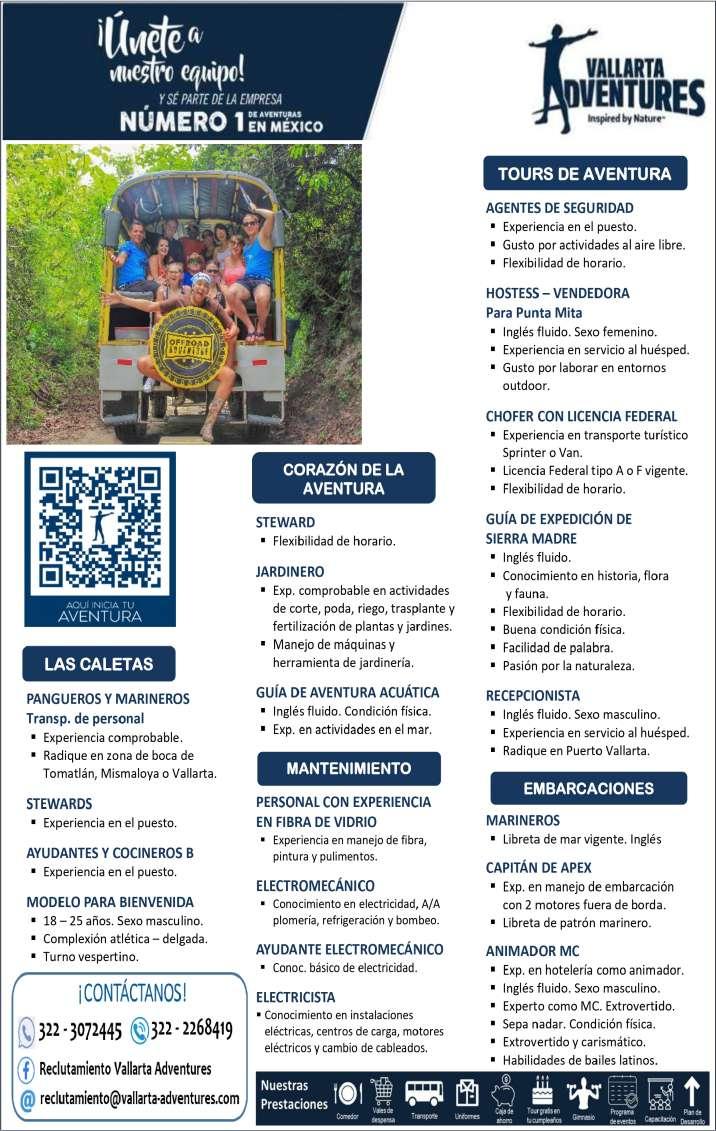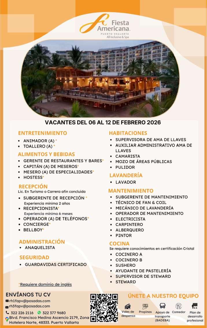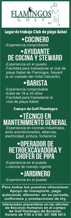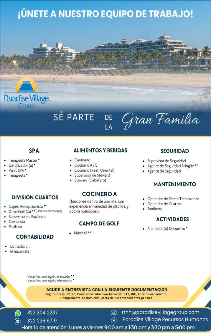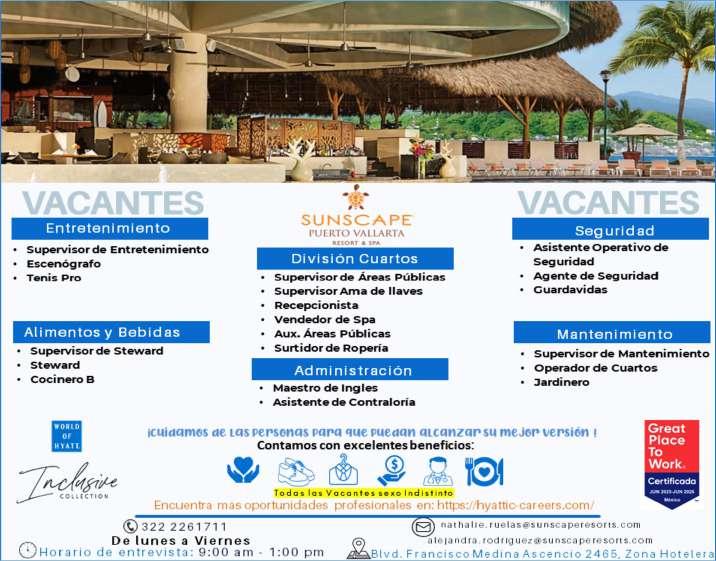Estamos solicitando el siguiente personal: Jardinero, Operador de Cuartos, Cocinero B, Tenis Pro, Escenógrafo, Recepcionista, Vendedor de Spa, Surtidor de ropería. Informes al. 322 22 617-11.+