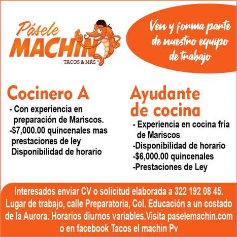 Buscamos cocineros B con experiencia, hostess con buena presentación, mesero con disponibilidad de horario. Inf. 322 22 309-28, 322 22 309-29.+