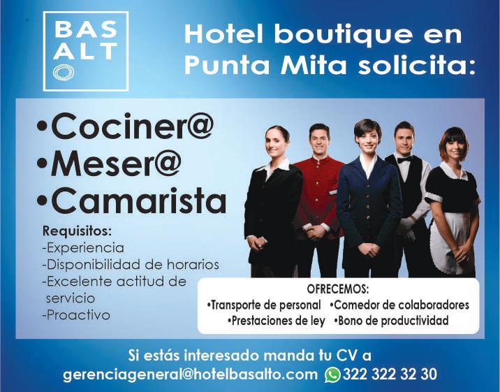 Hotel boutique en Punta Mita solicita cocinero. WhatsApp. 322 32 232-30.+