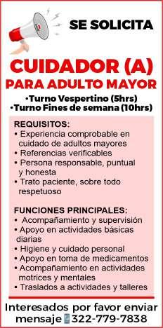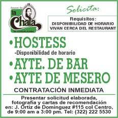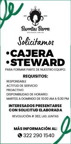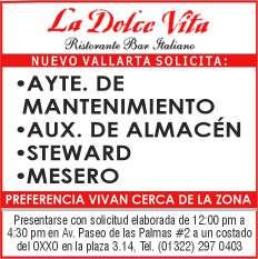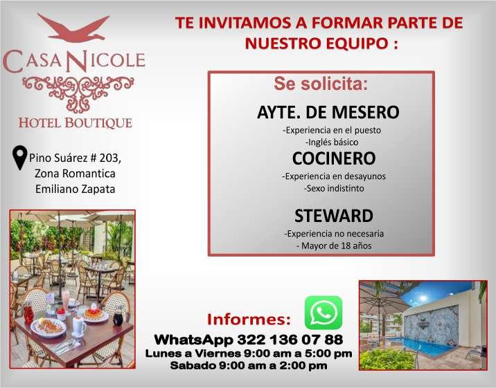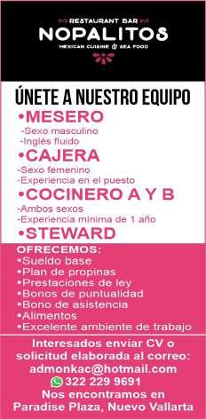 Se solicitan urgentes meseros, ayudantes de meseros, ayte. de bar, ayte. de cocina, cocinero, solo llamadas de 9:00 am a 6:00 pm, no mensajes al. 322 13 191-61.+