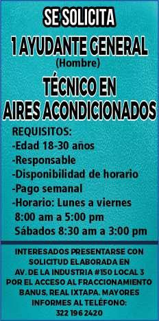 Se solicita ayudante de mostrador, ambos sexos. Informes al. 322 29 376-48.+